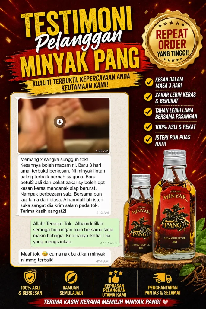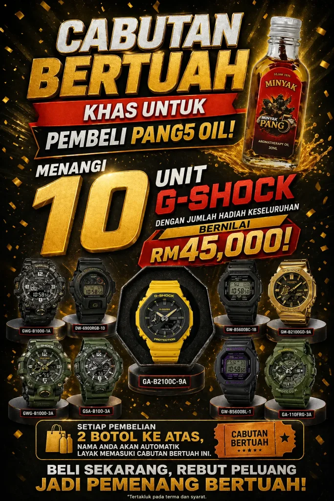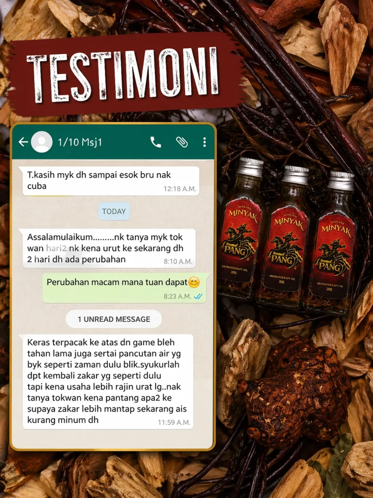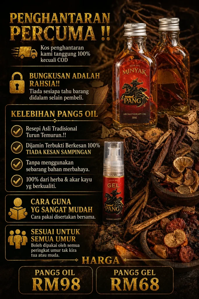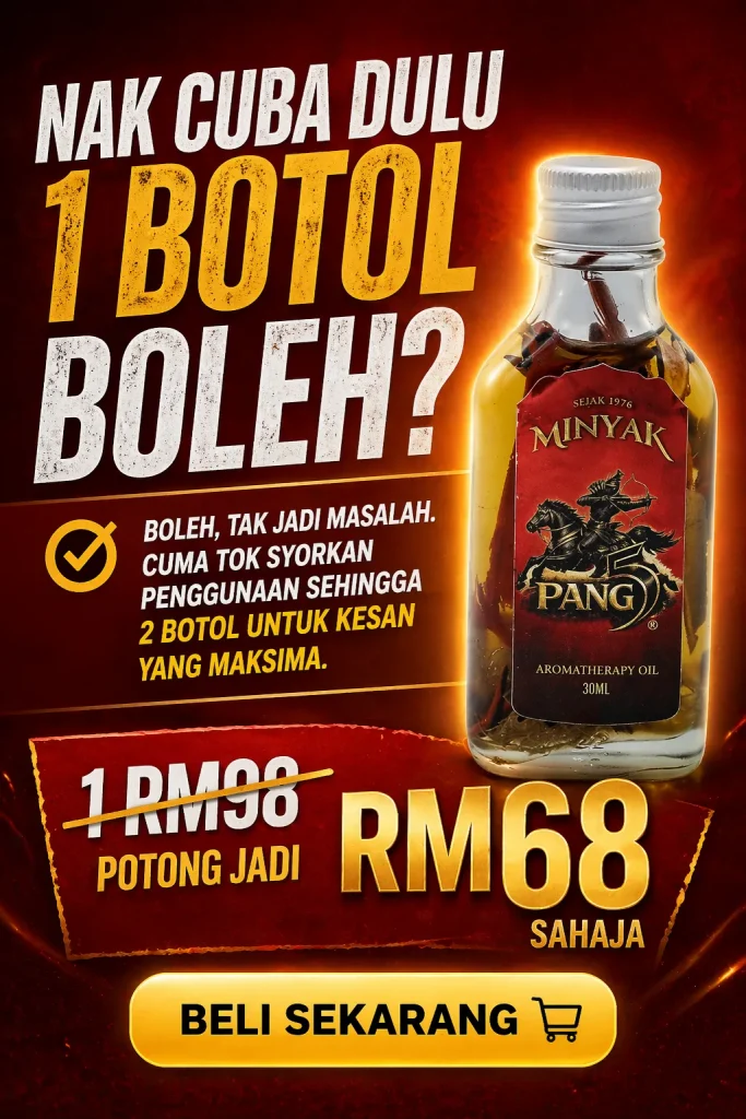 PENAFIAN: Produk ini adalah minyak untuk kegunaan luaran sahaja. Bukan ubat dan tidak bertujuan untuk mendiagnosis, merawat, menyembuhkan atau mencegah sebarang penyakit. Keberkesanan penggunaan bergantung kepada kesesuaian individu dan pengalaman setiap pengguna mungkin berbeza. Gunakan mengikut arahan yang disyorkan. Hentikan penggunaan jika berlaku ketidakselesaan atau iritasi. Elakkan terkena mata, mulut, luka terbuka dan kawasan sensitif. Simpan di tempat kering serta jauh daripada capaian kanak-kanak. Jika mempunyai masalah kesihatan atau kulit sensitif, dapatkan nasihat profesional sebelum penggunaan.