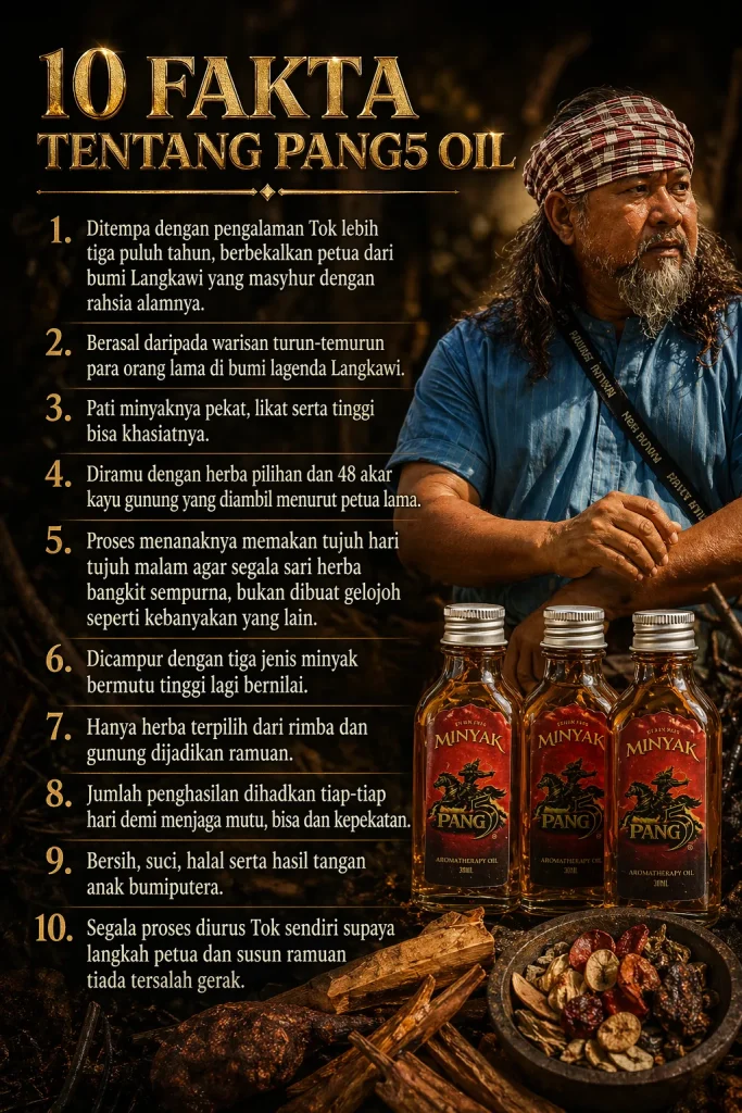 PANG5 Oil merupakan minyak herba tradisional dari bumi Langkawi yang diolah daripada petua lama turun-temurun. Dirumus dengan 48 herba terpilih menjadi minyak urut lelaki berasaskan bahan semula jadi.